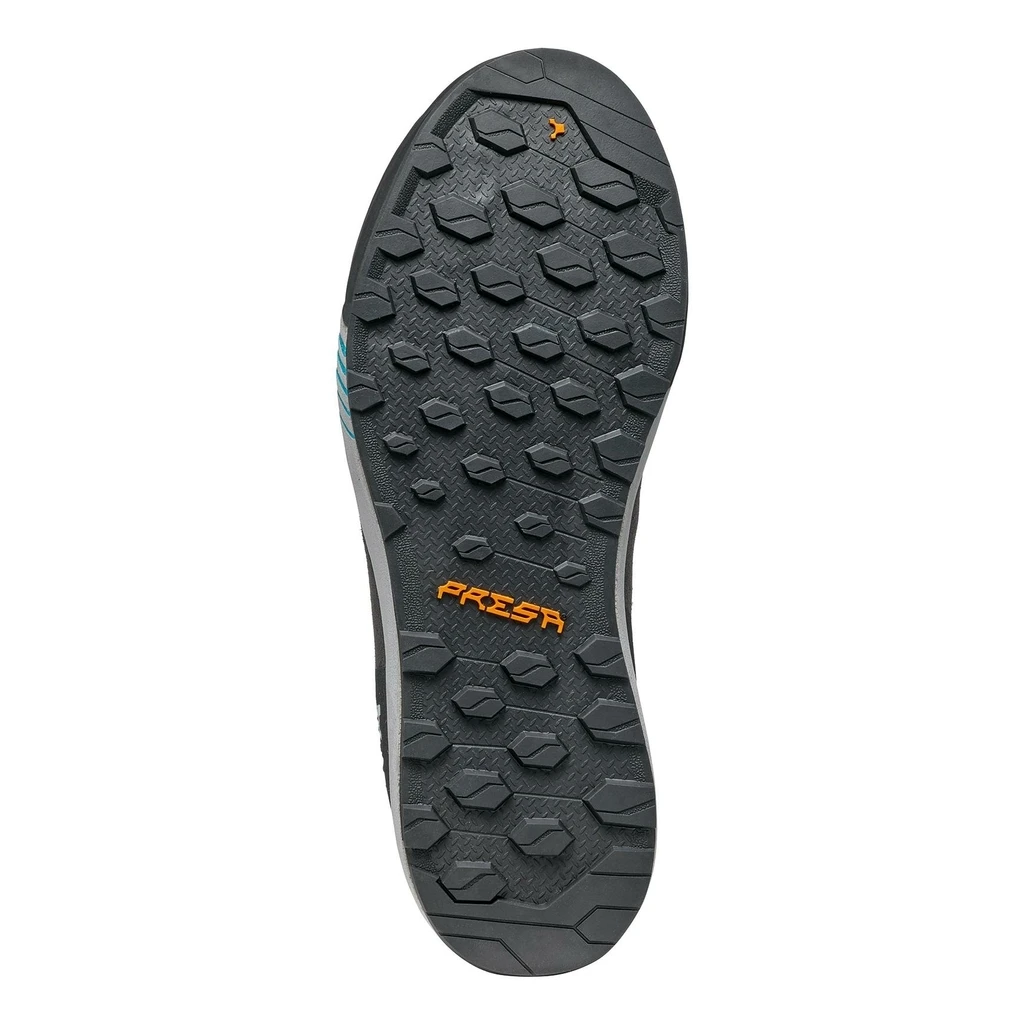 La semelle exterieure Presa développée par Scarpa est plus résistante que toutes les autres du marché. Abrasives, elles sont conçues pour résister aux balades sur les chemins rocheux ou en ville sur le bitume. Les crampons de la semelle vous offrent un grip trÚs interessant par temps humides comme par temps secs.