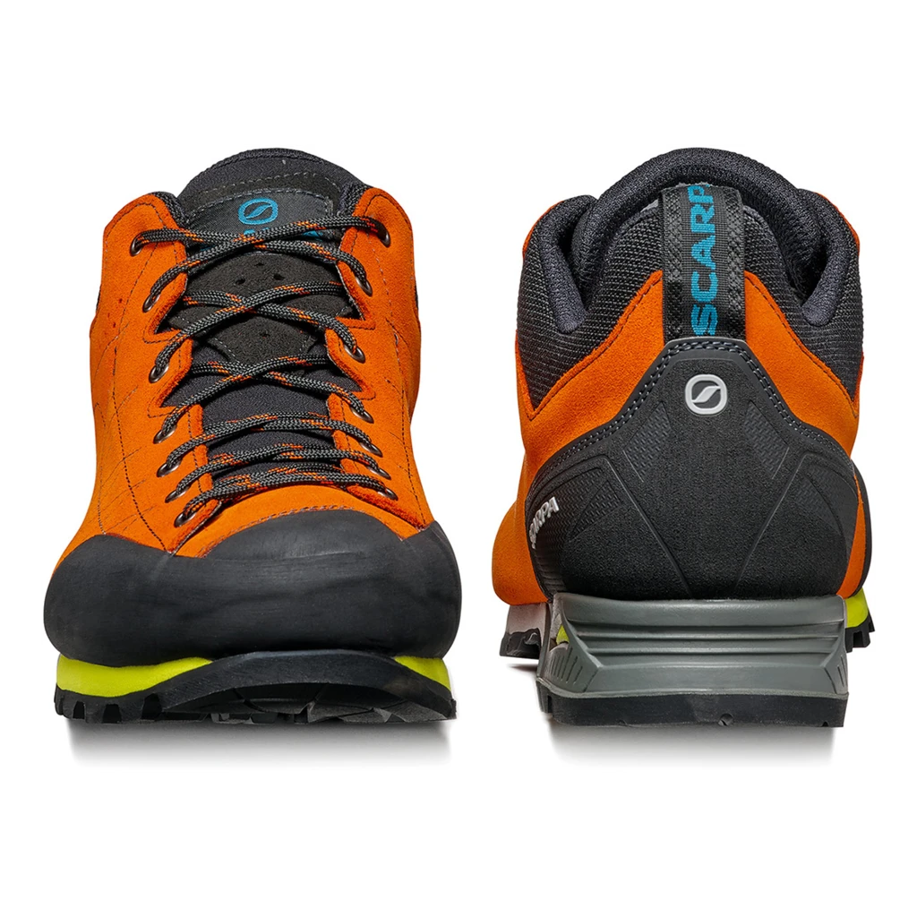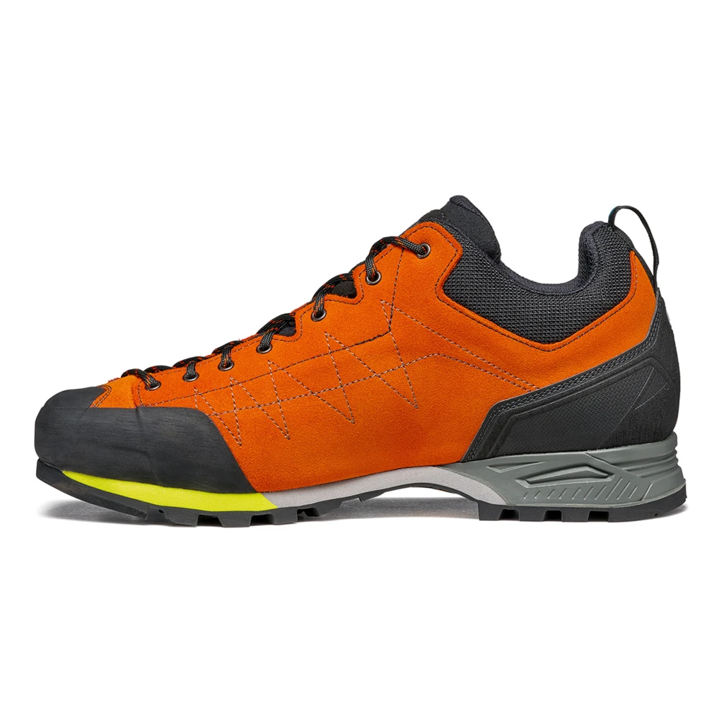 Les Zodiac de Scarpa sont aussi solides qu’une chaussure d’alpinisme, et aussi confortables qu’une chaussure basse. La grande rĂ©sistance des chaussures d’approche marquent des points grĂące au cuir supĂ©rieur pratiquement indestructible, ainsi qu’Ă la semelle solide. La semelle Vibram adhĂ©rente dispose d’une profondeur de profil moyenne pour de meilleures propriĂ©tĂ©s de prise et de frottement sur un terrain rocheux. Elle convient Ă©galement aux terrains mixtes et ne fait pas non plus la fine bouche en cas de montĂ©e escarpĂ©e.De plus, les chaussures sĂ©duisent grĂące Ă leur ajustement convainquant. Le bord de tige ergonomique et la languette Ă©lastique veillent Ă un trĂšs bon maintien du pied.